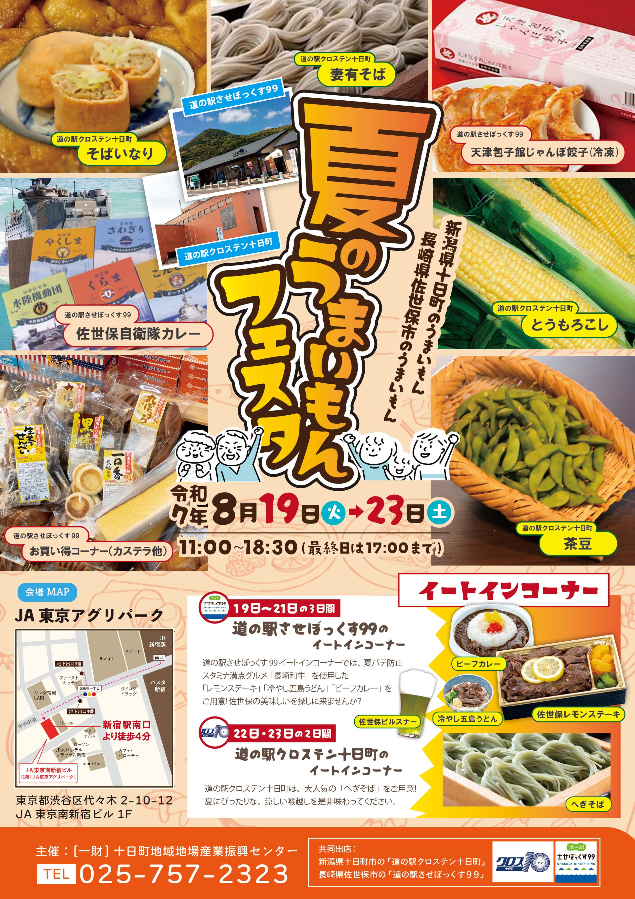 新潟県十日町市と長崎県佐世保市の合同物産展を開催します。野菜、果物、ご当地グルメや物産品など、幅広い品揃えで楽しいブースとなっています。させぼっくすから、佐世保特産品を中心に、長崎県産品など80商品を、準備しております。